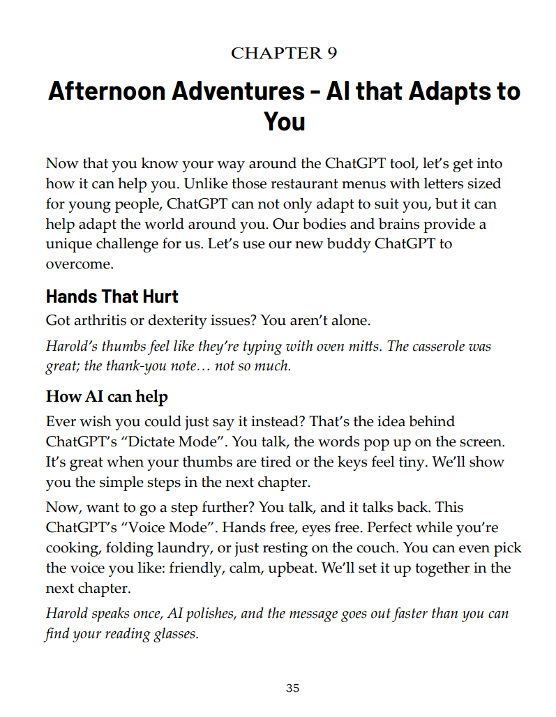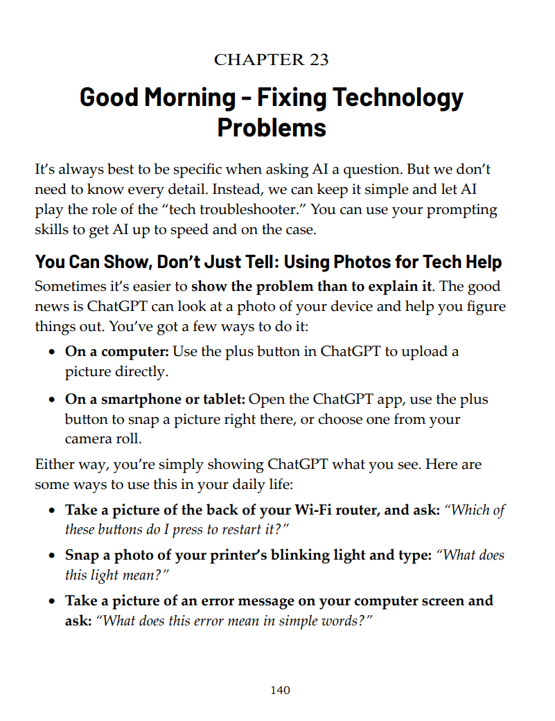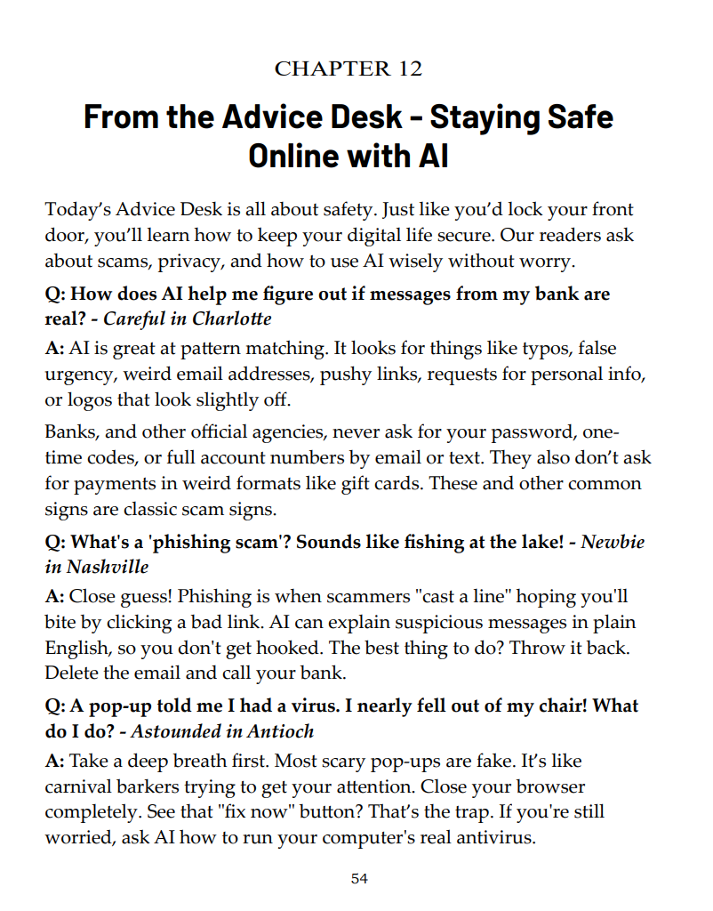 Instead of teaching complicated computer skills, the book focuses on real-life situations where AI can save time, reduce confusion, and build confidence.
