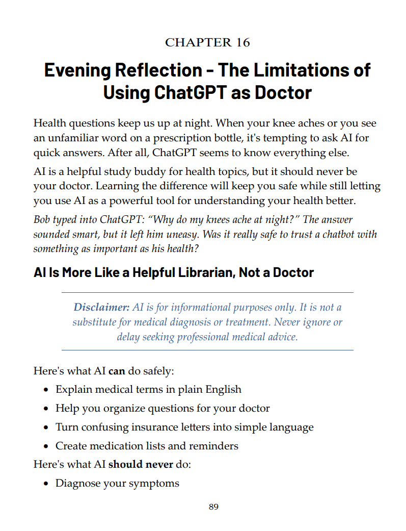 Your safety is our priority. We reinforce the book and the AI tools it discusses are meant to help explain things and offer guidance, not replace doctors, lawyers, or financial professionals. For important health, legal, or money decisions, always check with a qualified expert you trust.